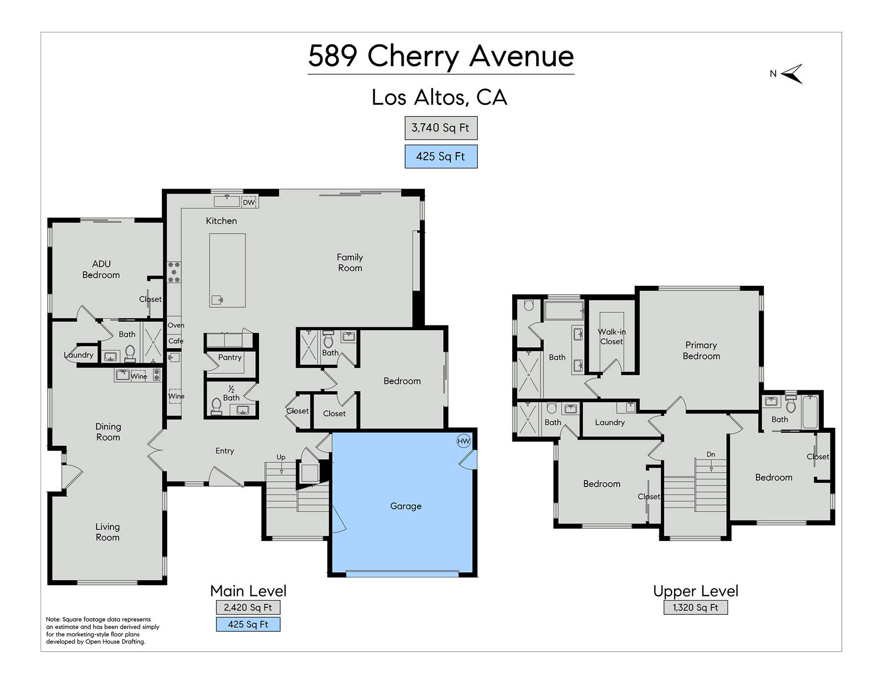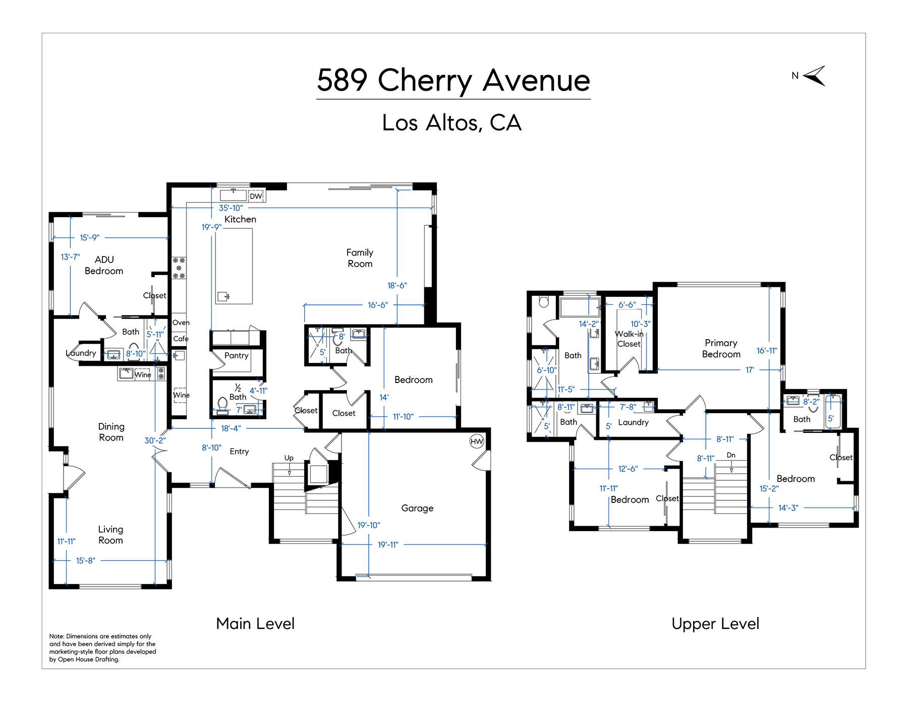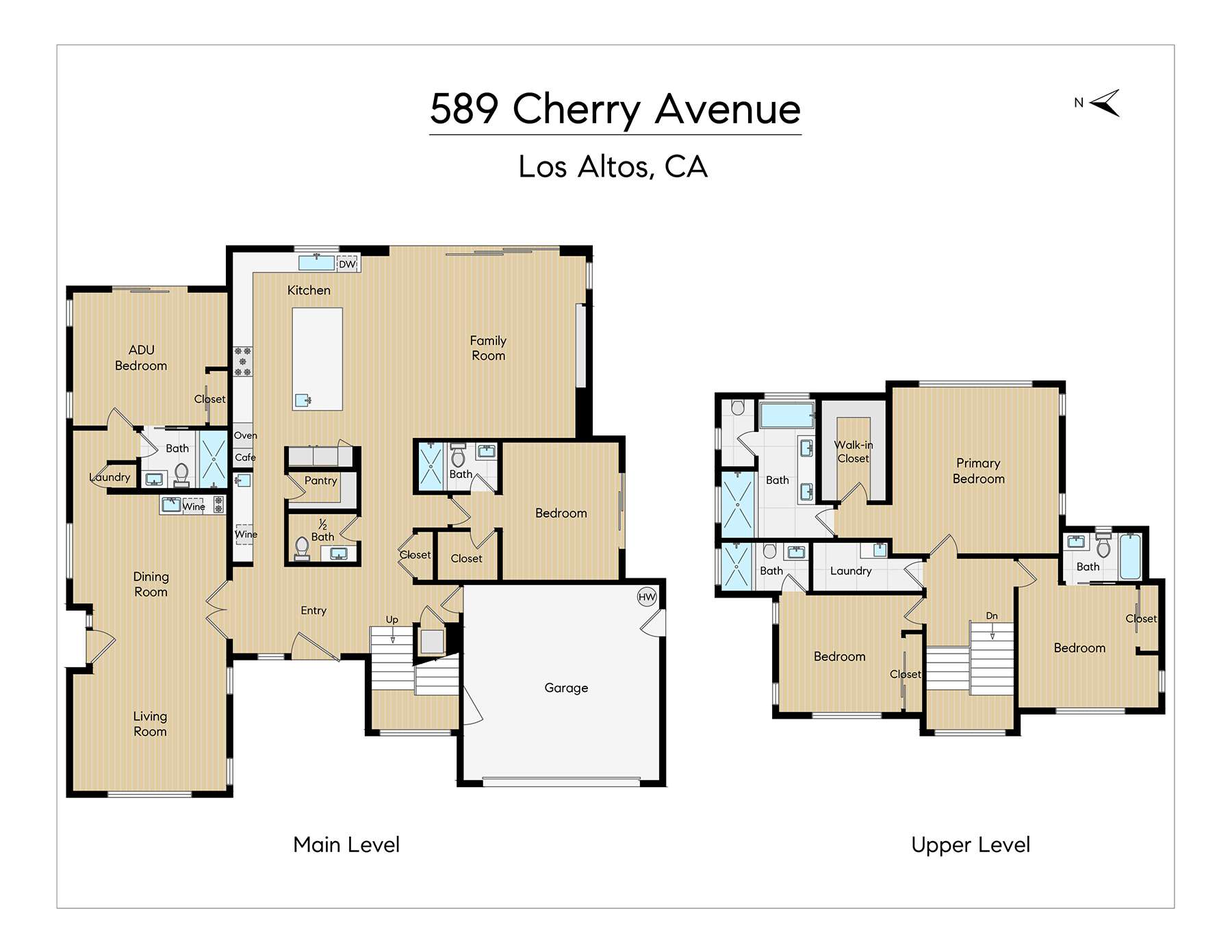 - Two levels with 5 bedrooms and 5.5 baths, including attached 1-bedroom, 1-bath ADU