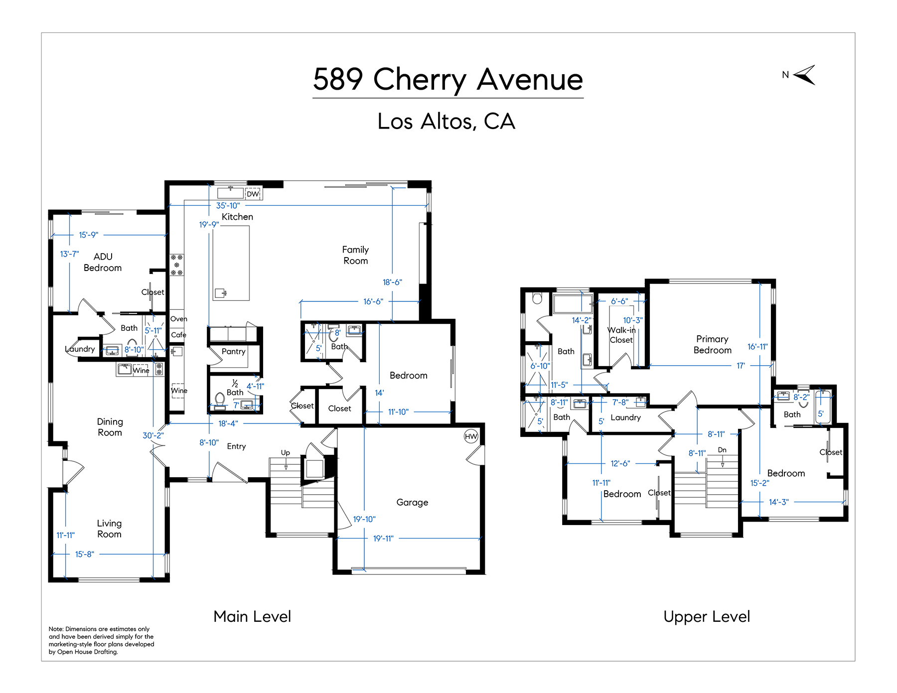 - Two levels with 5 bedrooms and 5.5 baths, including attached 1-bedroom, 1-bath ADU